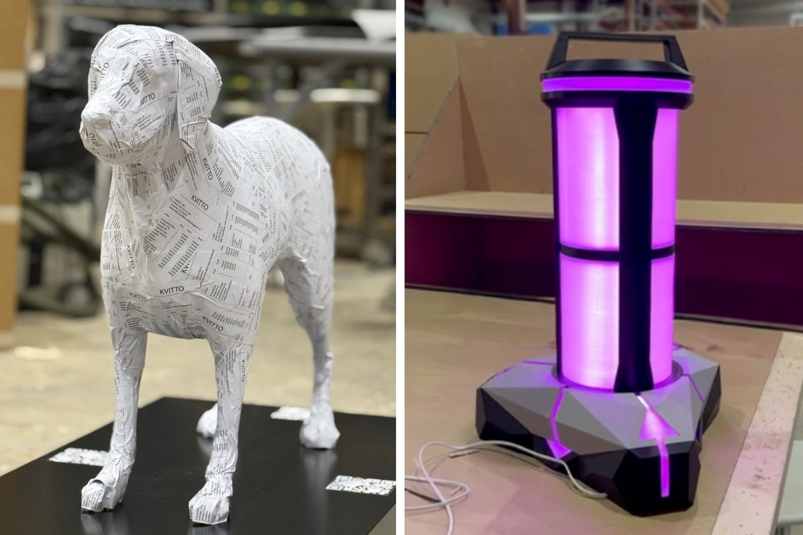 Några exempel på kunduppdrag: en hund i verklig storlek till Hundstallet och en lampa till en annan kund.