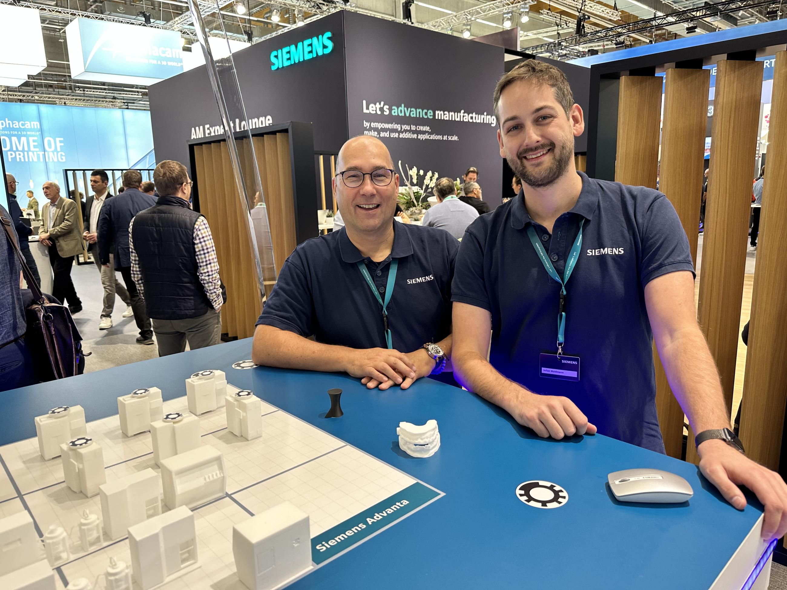 ”Med rätt ekosystem, digitalisering och automation kan AM möjliggöra innovation för industrin”, säger Julian Waldmann (th), Solution Director Additive Manufacturing, Siemens Digital Industries.
