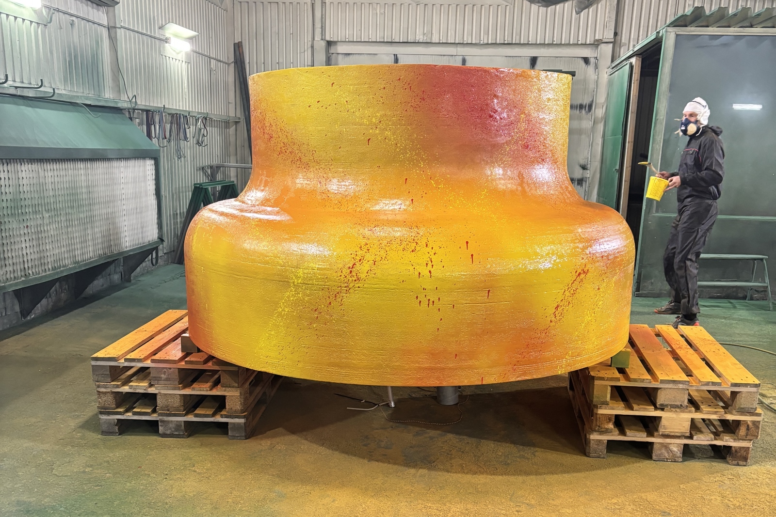 Målning av den 3D-printade jätte-Bumlingen i tre färger: Traffic Orange, Traffic Yellow och Traffic Red.