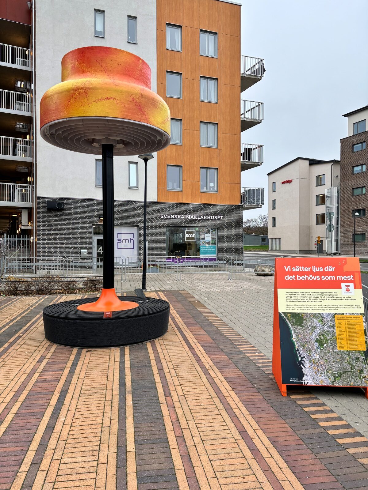 Lampan på plats i området Maria Park i Helsingborg. Den är en del av ett trygghetsskapande projekt i staden.