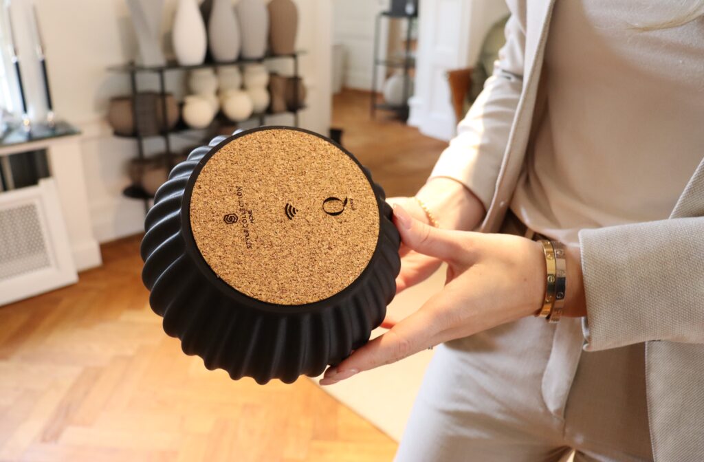 – Det tog ungefär tre timmar per vas och eftersom jag har tillgång till Lostboyslabs 3D Print Farm med många printers så gick det ganska snabbt. Undertill har vi satt en korkbotten med ett NFC-chip så att mottagaren kan spåra produkten och skurit ut företagsnamnet med laser.