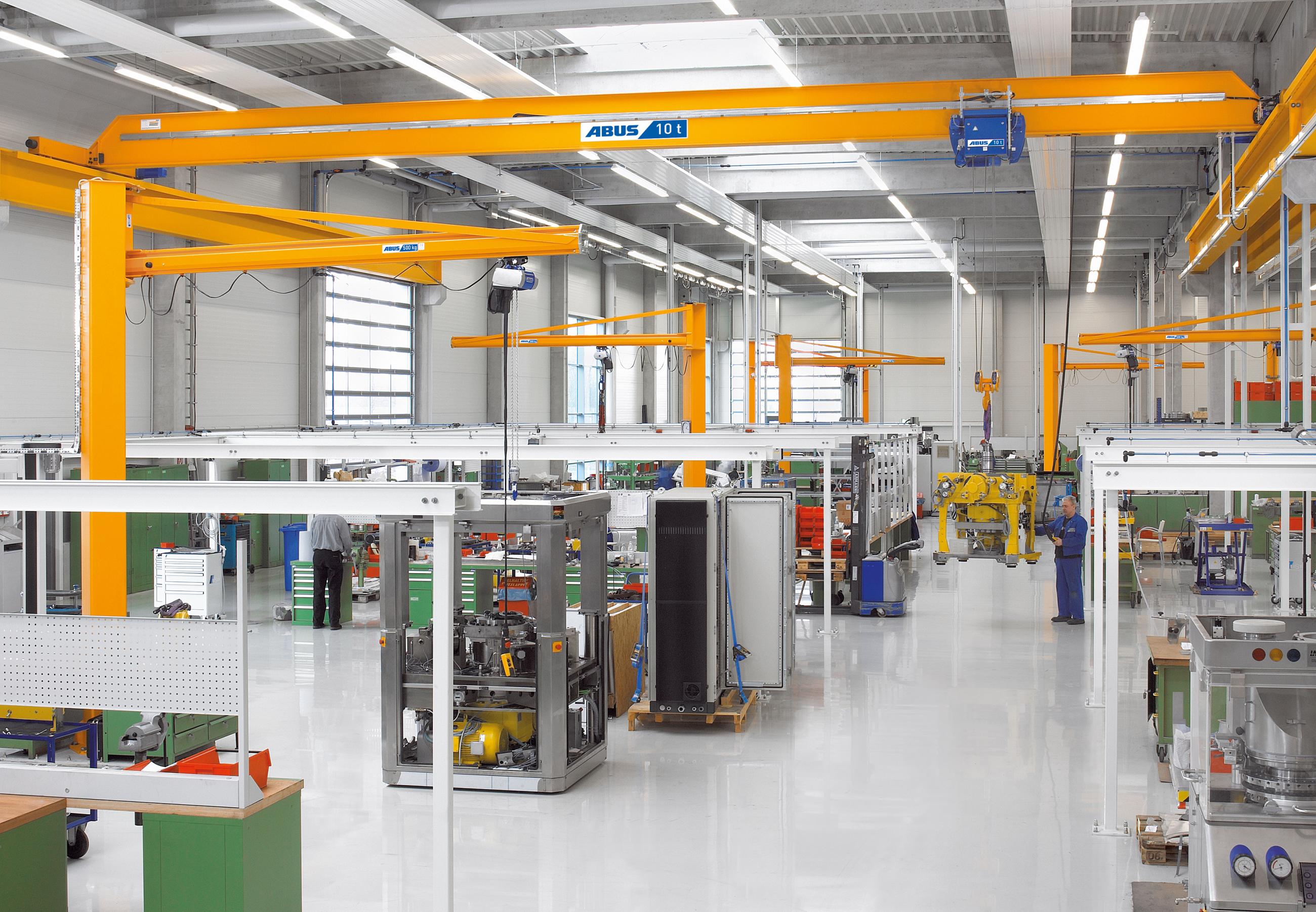 Här hos ABUS Kransystem tillverkas standardiserade traverser, svängkranar, lättraverser och lin- och kättingtelfrar. Kranarna har en lyftkapacitet från 80 kg upp till imponerande 120 ton och företaget står för ett stort tekniskt kunnande.