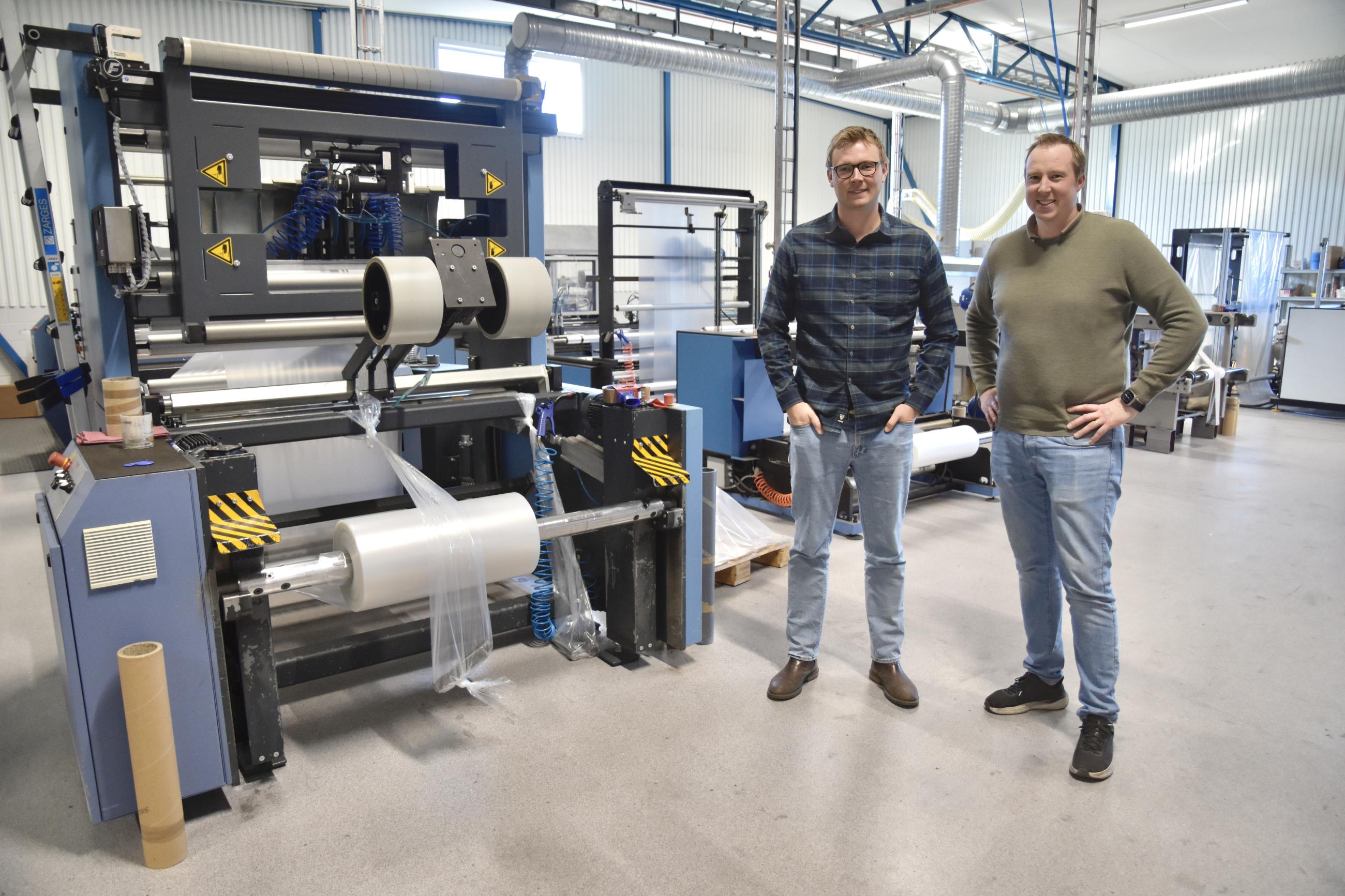 Bröder och kollegor. John Fredriksson (tv) och Jakob Hoof i maskinhallen där en stor del av utrustningen från Wästgöta Plast flyttat in.