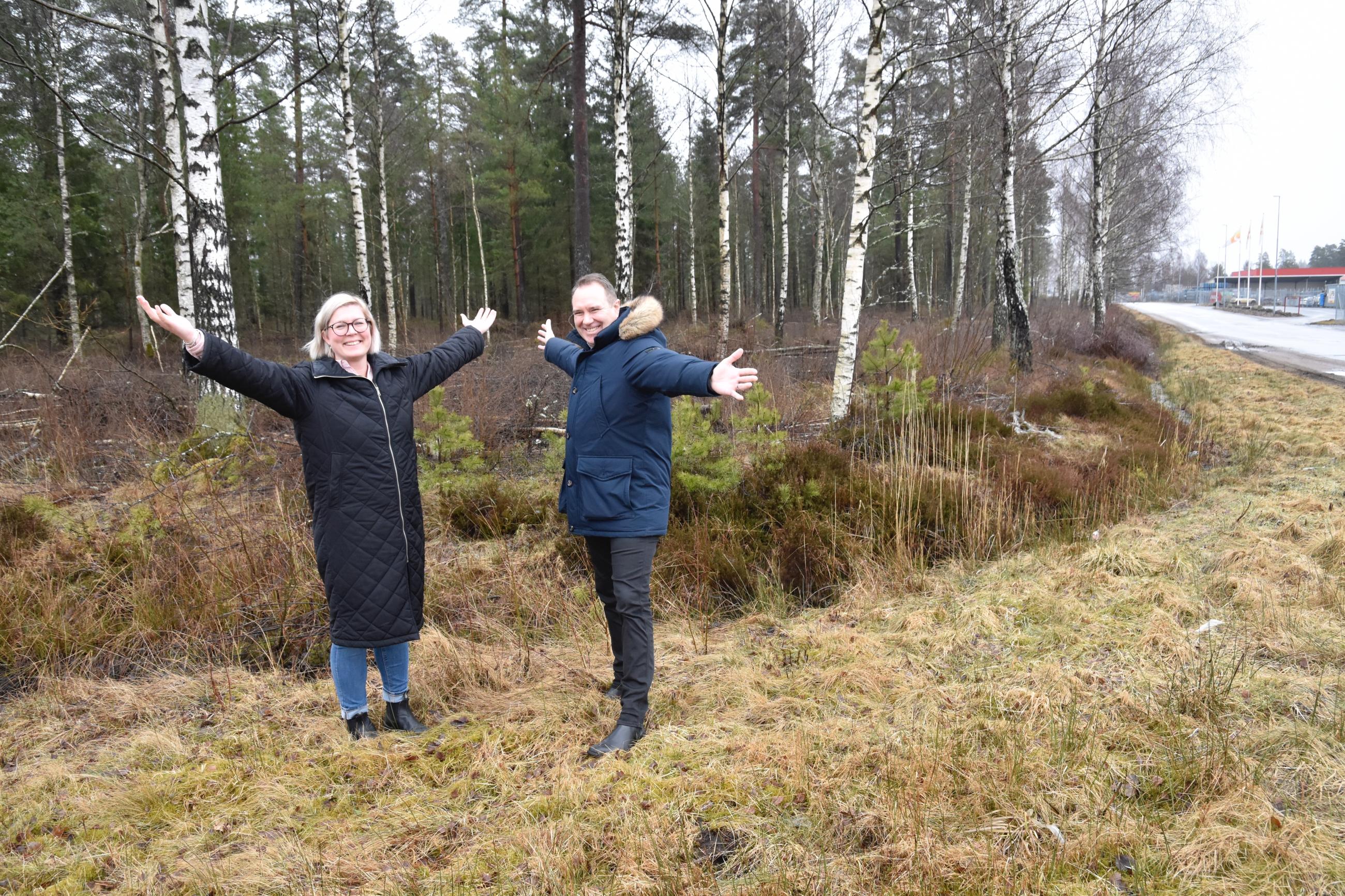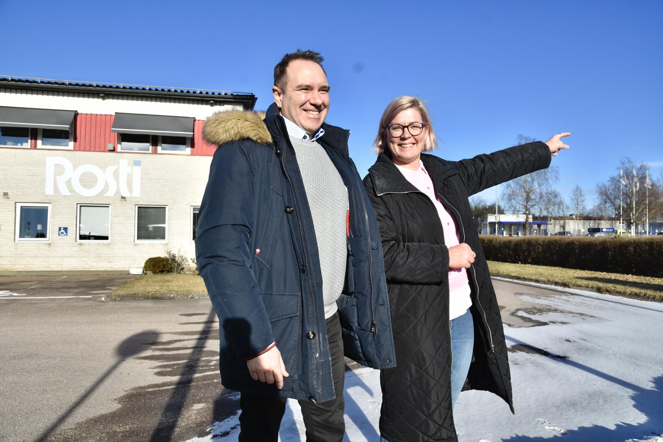 Framtiden väntar runt hörnet. 2 km från Rosti GP:s nuvarande anläggning byggs den nya fabriken. ”Förväntan är stor” säger Magnus Hettne och Madeleine Tybert Kothe.