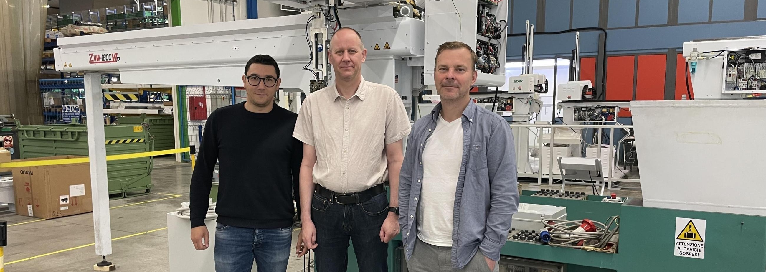 Fabriksbesök i Italien. Mauro Bettio från Star tillsammans med Henrik Ritzman och Jörgen Tylenius från Sävjo Plastic, vars robot är redo för leverans.