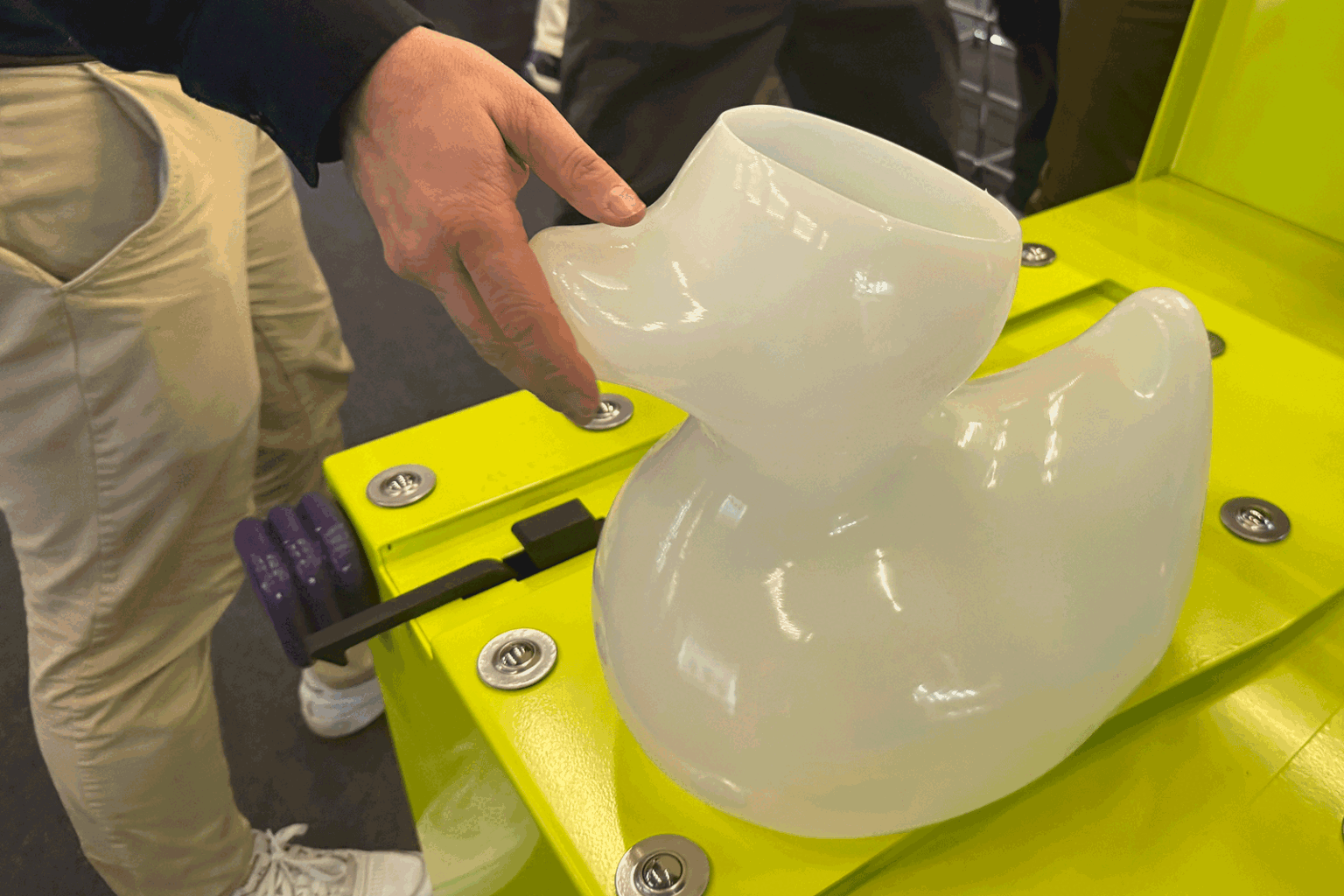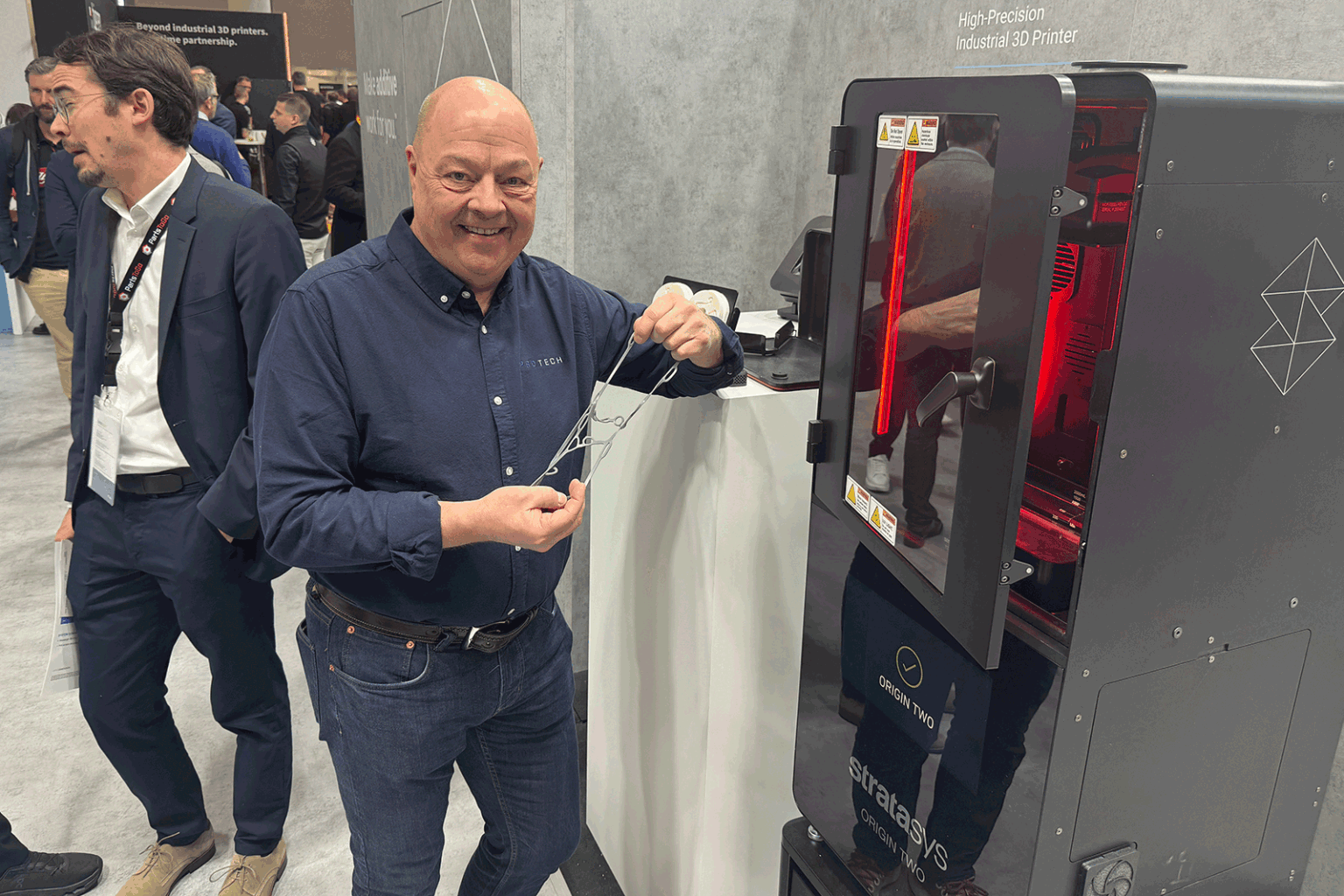 Protech är sedan 1990-talet återförsäljare för Stratasys, och det första självklara stoppet var därför i deras monter. Det Anders Brask lyfter fram som en viktig nyhet är ett nytt äkta silikonmaterial. P3 Silicone 25A är utvecklat för DLP-plattformen Origin och det har Stratasys tagit fram tillsammans med Shin-Etsu, som är en ledande tillverkare av silikon. Att 3D-printa silikonkomponenter kan vara ett mer tids- och kostnadseffektivt alternativ till formsprutning.