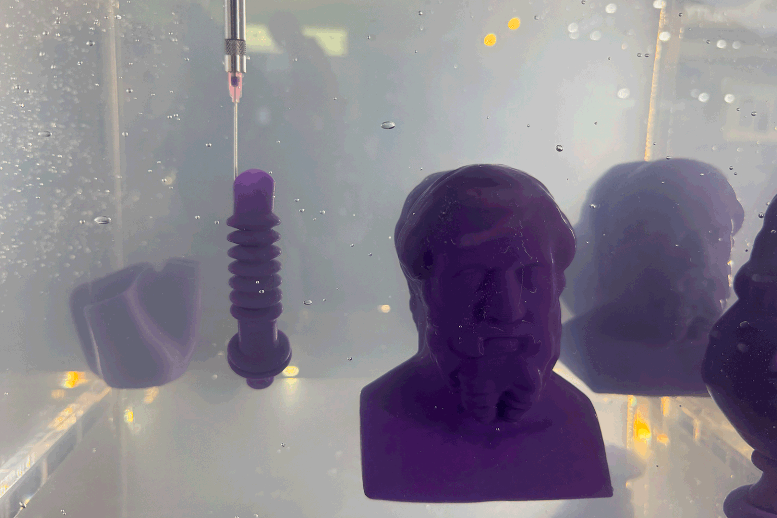 Med Rapid Liquid Prints (RLP) plattform Levity är det möjligt att extrudera silikon i en stor gelkub. Det krävs inget annat stödmaterial och det är bara att tvätta delen när den är färdigprintad.