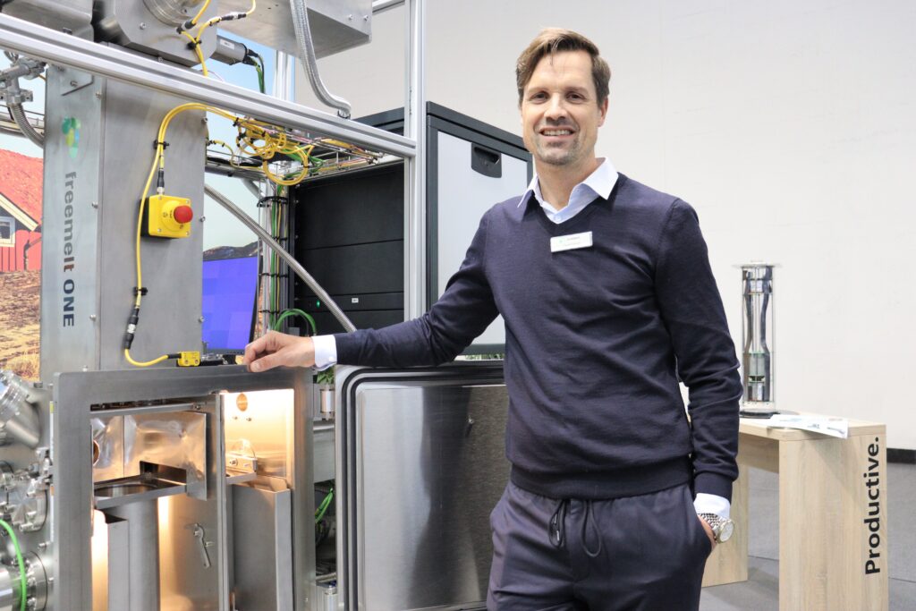 En viktig pusselbit i det är det kommande eMelt-systemet för storskalig industriell produktion med Electron Beam Powder Bed Fusion-teknologin (E-PBF), som lanserades under Formnext. Daniel Gidlund säger att intresset varit stort under mässan, trots att ett fysiskt exemplar av maskinen ännu inte visats offentligt. Han visar istället en videopresentation som projiceras på monterns vägg som beskriver utförande och funktioner (se nedan).