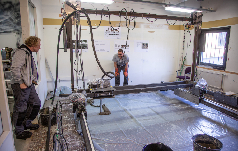Efter långa dagar i verkstaden, med många delar som att skruva samman, lyckades de till slut få fram en fungerande prototyp. I dag står den i Tumba i Stockholm och kan skriva ut betongdelar som är två och en halv meter breda och två meter höga.