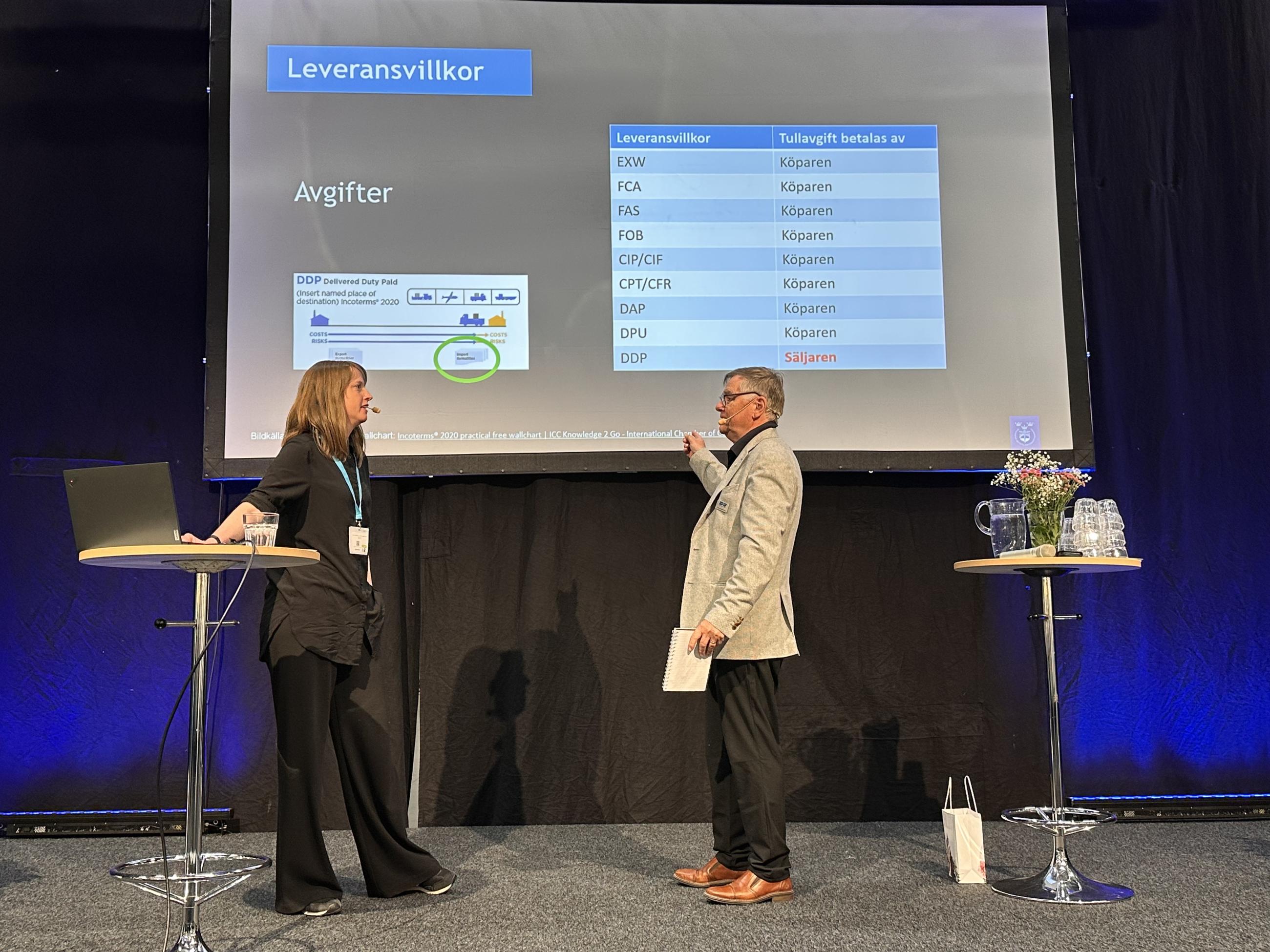 Tullreglerna – en utmaning att förstå. Malin Madsen, strategisk rådgivare på Handelskammaren, tillsammans med Lennart Johansson, SPIF, moderator för scenprogrammet.