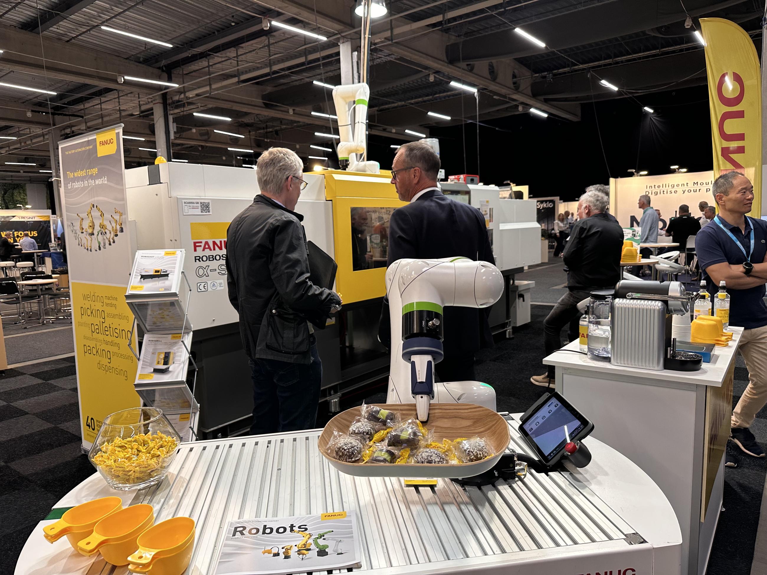 En robot kan betjäna maskiner – och människor. I Fanucs monter bjöd coboten på gofika, och kaffet kunde intas i kåsor som formsprutats på plats.