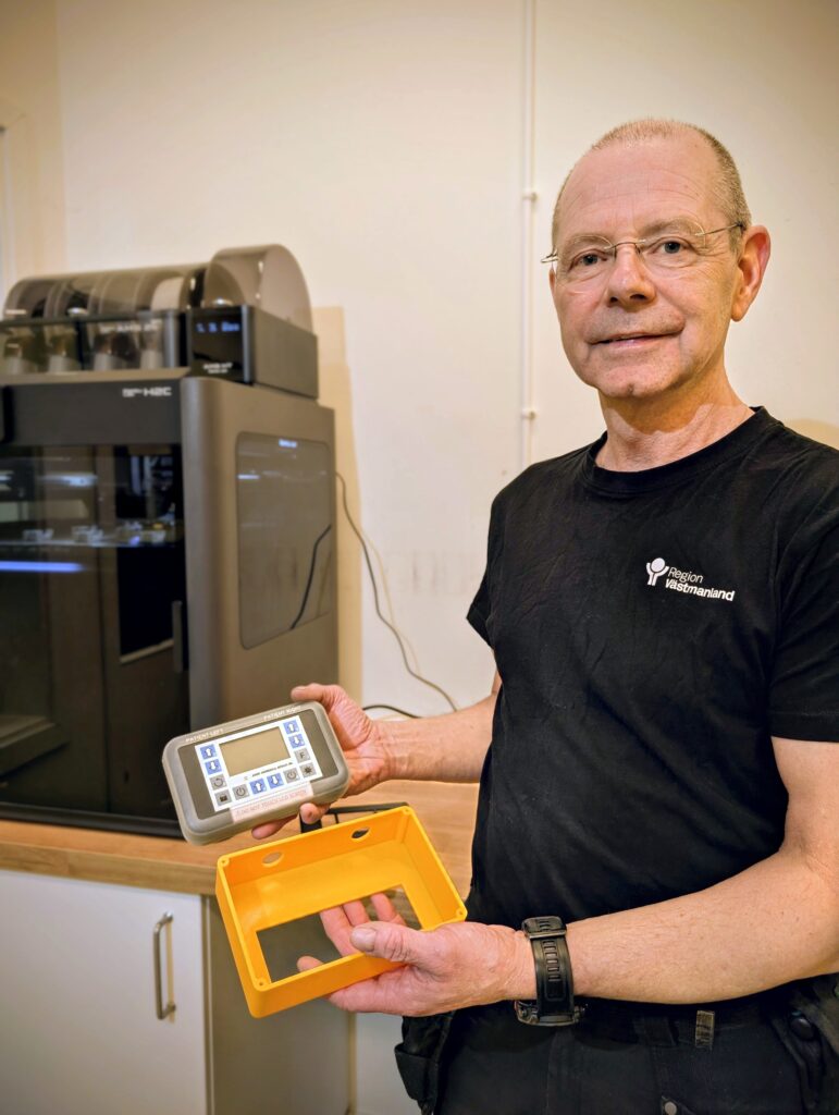 Hjälpmedelstekniker Leif Söderberg visar en skyddslåda som han skrivit ut till ett andningshjälpmedel. Foto: Pressbild/Region Västmanland