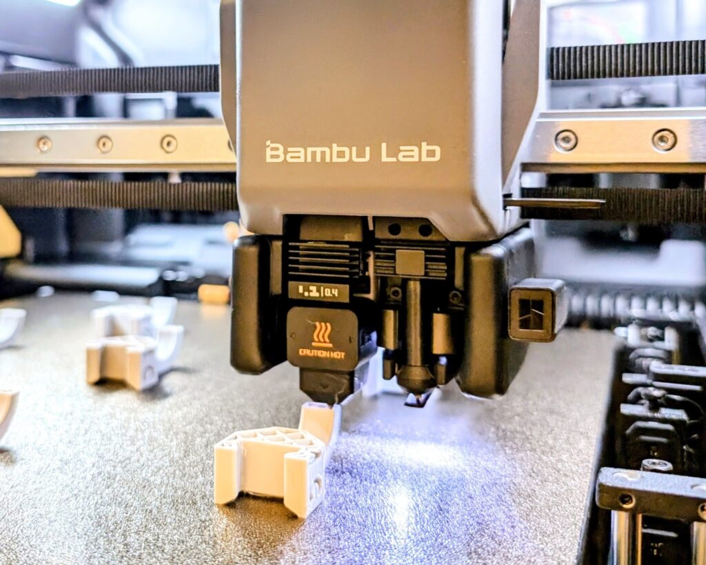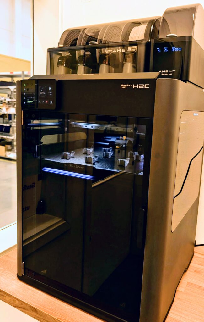 I maskinparken finns en filamentskrivare från Bambu Lab, av modellen H2C som lanserades på Formnext inklusive en AMS2. För att kunna arbeta med individanpassning finns även en 3D-skanner.