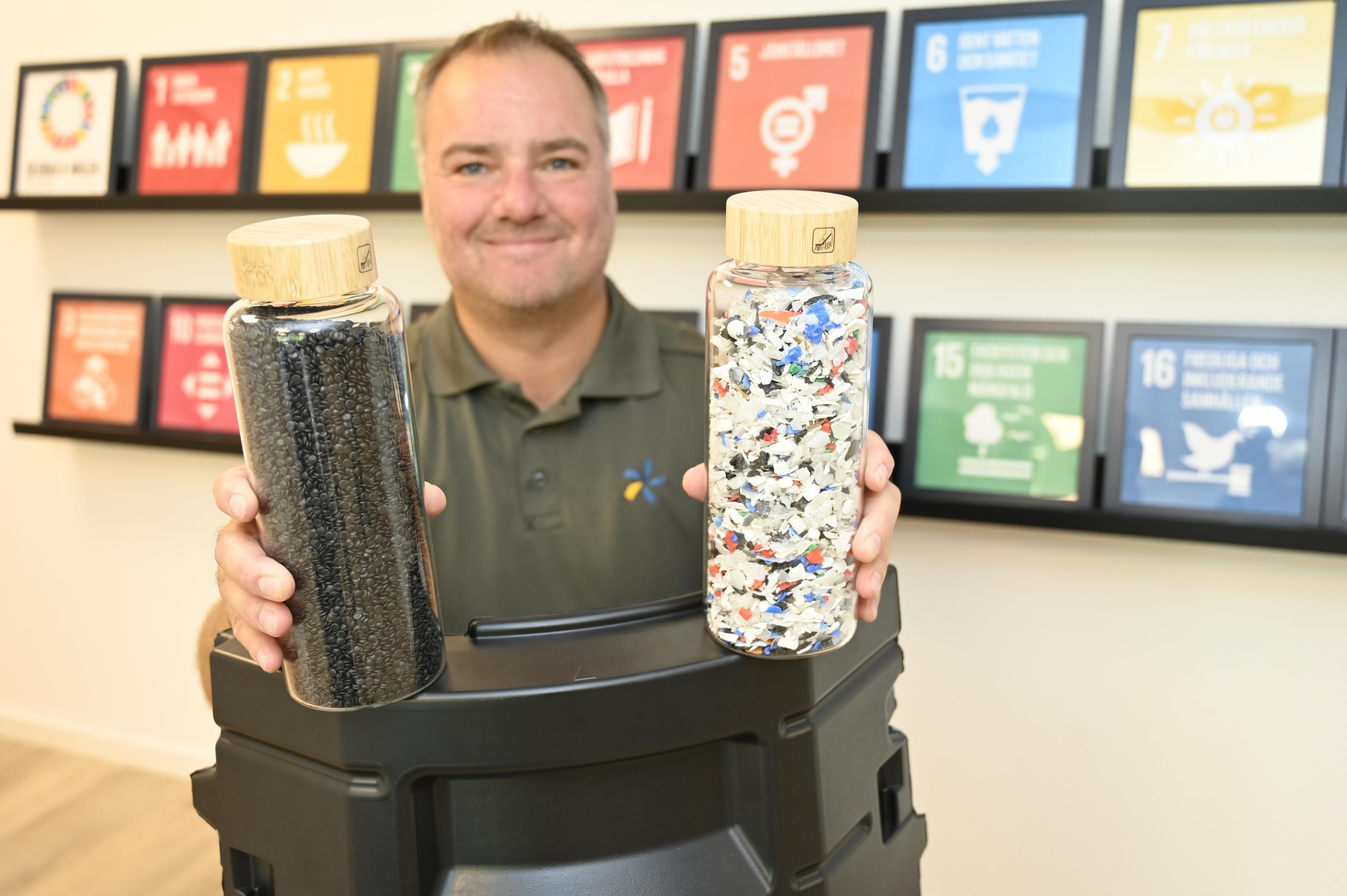 Formblåsning i 100 procent återvunnet material hos Blowtech, här med hållbarhetschef Mikael Good.