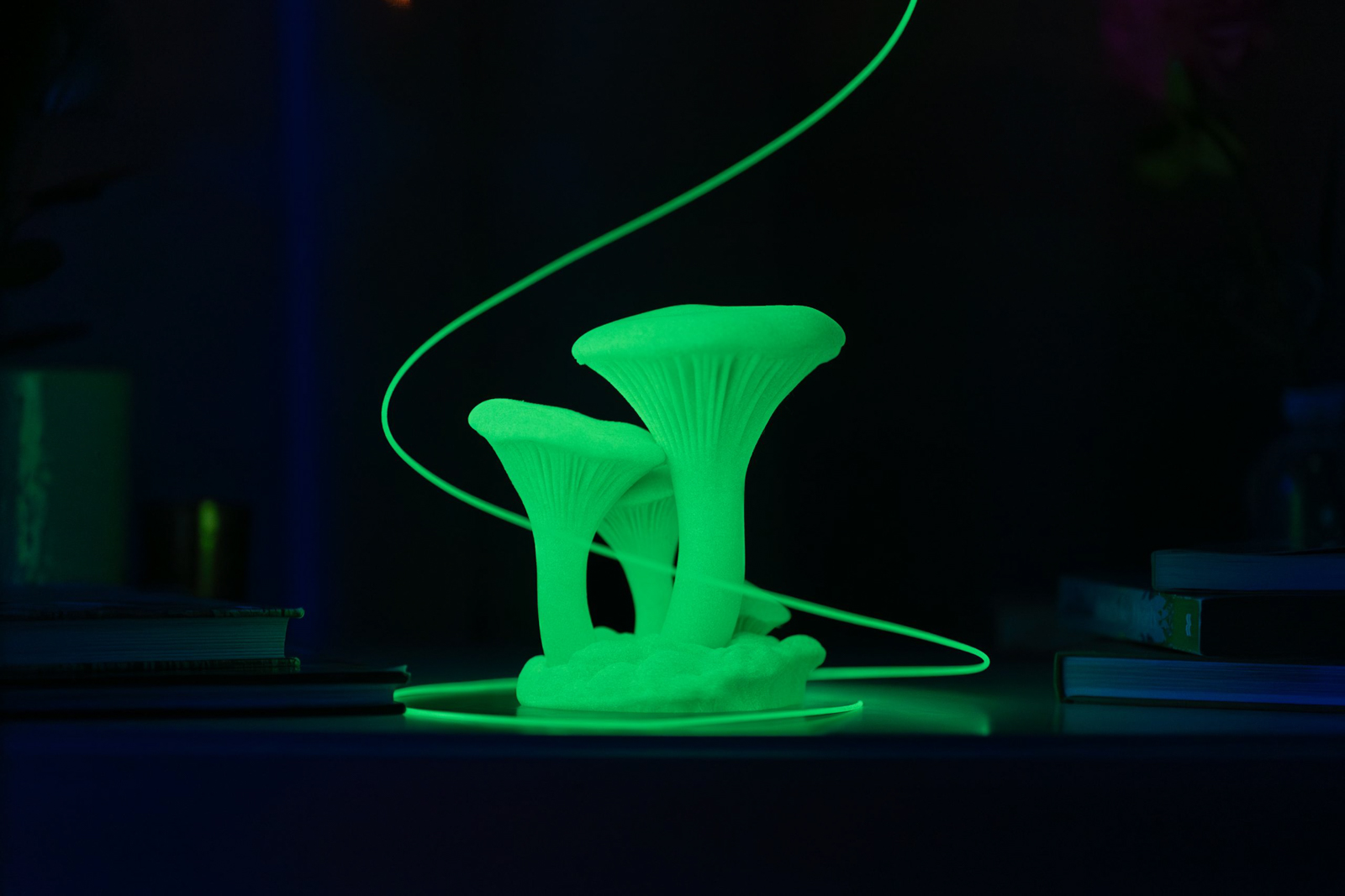 För att uppnå den självlysande effekten har Prusa använt ett transparent filament och fyllt det med ett pulver som innehåller strontium. Ett ämne som varken är giftigt och inte heller reagerar med vatten eller vanliga kemikalier. Det laddas genom att exponeras för en ljuskälla, såsom en stark LED, en glödlampa, solljus eller UV-ljus.
